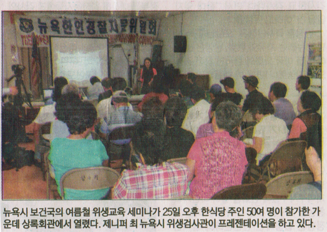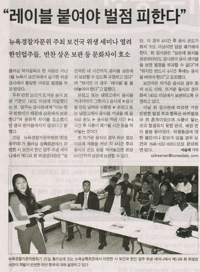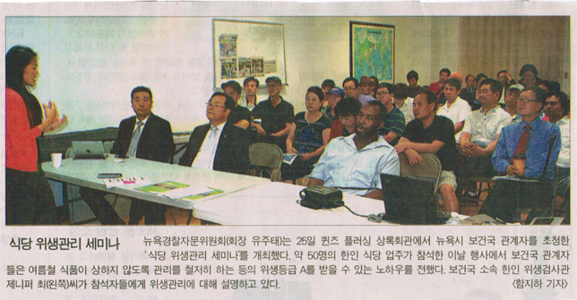 At July 25th, New York Police held a seminar for Health Center at Flushing preparing Korean business owners in the seminar. Jennifer Choi, sanitary inspector stated " foods at room temperature should be up no more than four hours to keep the freshiness. However, to be safe, a 'label' should be put to be precautious." Many rules were discussed and brought up in the seminar.